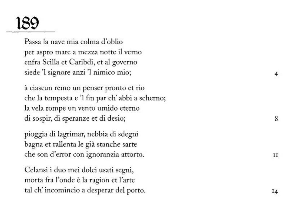 | Amor, che nel penser mio vive et regna e 'l suo seggio maggior nel mio cor tene, talor armato ne la fronte vene; ivi si loca et ivi pon sua insegna. Quella ch'amare e sofferir ne 'nsegna, e vol che'l gran desio, l'accesa spene, ragion, vergogna, e reverenza affrene, di nostro ardir fra se stessa si sdegna. Onde Amor paventoso fugge al core, lasciando ogni sua impresa, et piange et trema; ivi s'asconde et non appar piu fore. Che poss'io far, temendo il mio signore, se non star seco infin a l'ora estrema? che bel fin fa chi ben amando more. |