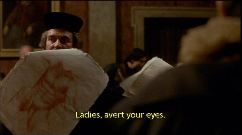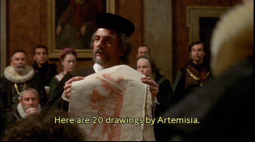 The sexist prosecutor "concerned" with his female audience as he shows the evidence of Artemisia's "depravity." How different is his attack on Artemisia from the feminist attack on the film, insofar as both read the paintings in relation to the life? (Tassi's mistake in the film is to read the drawings similarly as evidence of Artemisia's sexual experience.)