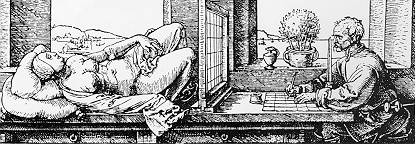 Though widely criticized by feminist film critics and revised by Mulvey herself, Laura Mulvey's notion of the cinematic male gaze has been widely adopted by feminist critics to trash Artemisia. Griselda Pollock, Shiela ffolliot, and Susan Fellman adopt a simplistic binary opposition between Artemisia as gazer and as gazed to deplore a transition in the opening credits from the focus on Artemisia's eye (drawing) to her drawing herself by candlelight (object of the gaze). The price of the clarity of their argument is its crudity; it is the product of an intellectual blindness to anything in the film that challenges and resists Mulvey's view of the male gaze. Artemisia is clearly both looking at herself and drawing herself, and she is not adopting pornographic poses, though she is posing. The rapid editing and quick changes of poses recall the quick eye movements of the very opening of the film. Moreover, the music on the soundtrack is similar in both scenes. And the reflection of the candlelight on her eyeball, the momentarily blackness as she shifts her view or blinks here eye, and the written credits suggest stains on her eye, a kind of blind spot, or what Jacques Lacan would call the objet petit a, the blind spot that structures vision (or what Paul de Man views as the blindness that enables insight). Artemisia's eyes are also wide open at various other scenes in the film involving sex and art. Thouogh Fellman and ffolliot have both used Duerer's woodcut to argue that the male gaze is sexist, they don't read the woodcut from the woman model's point of view, only the artist's. (See Freedman)