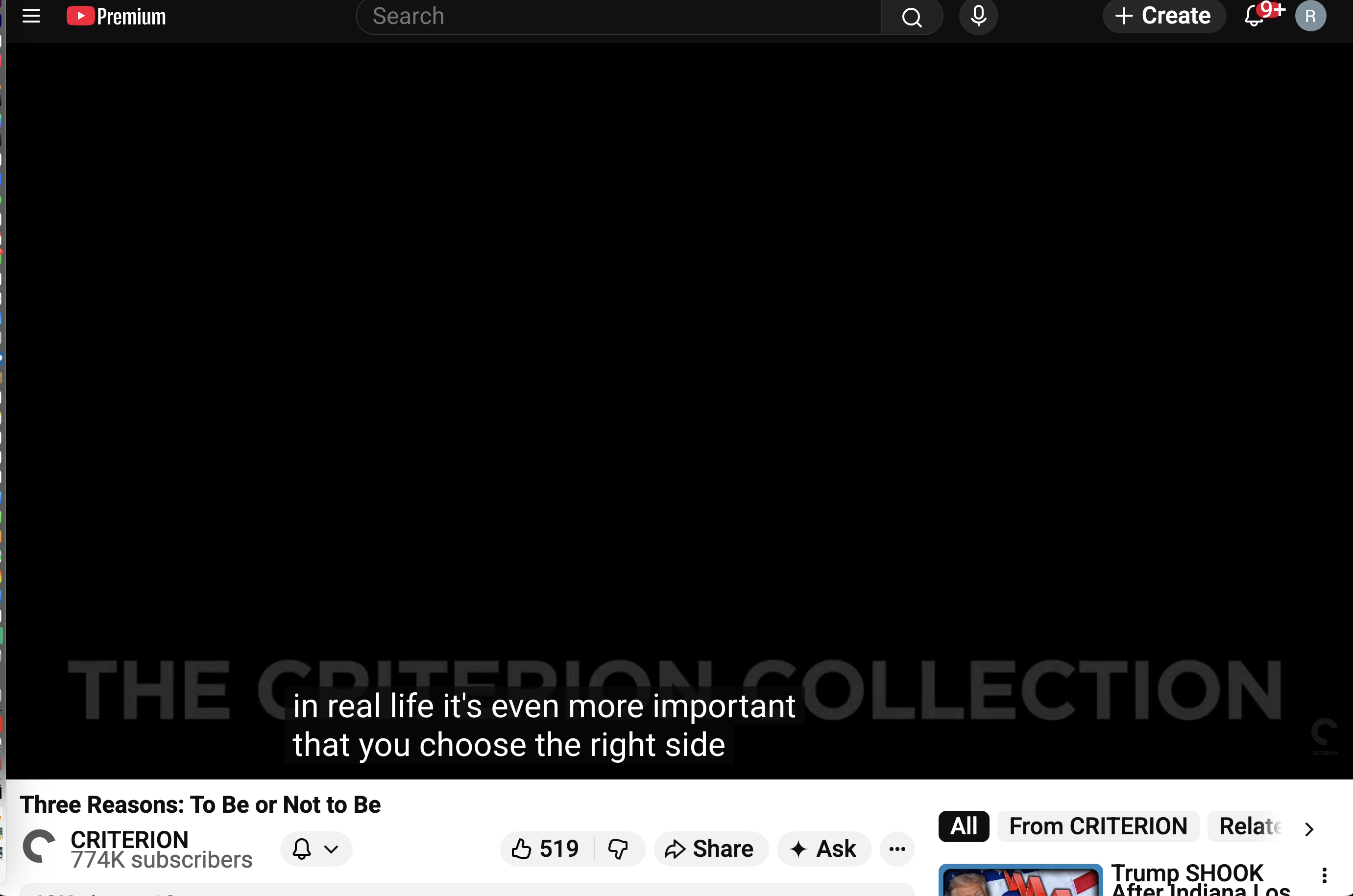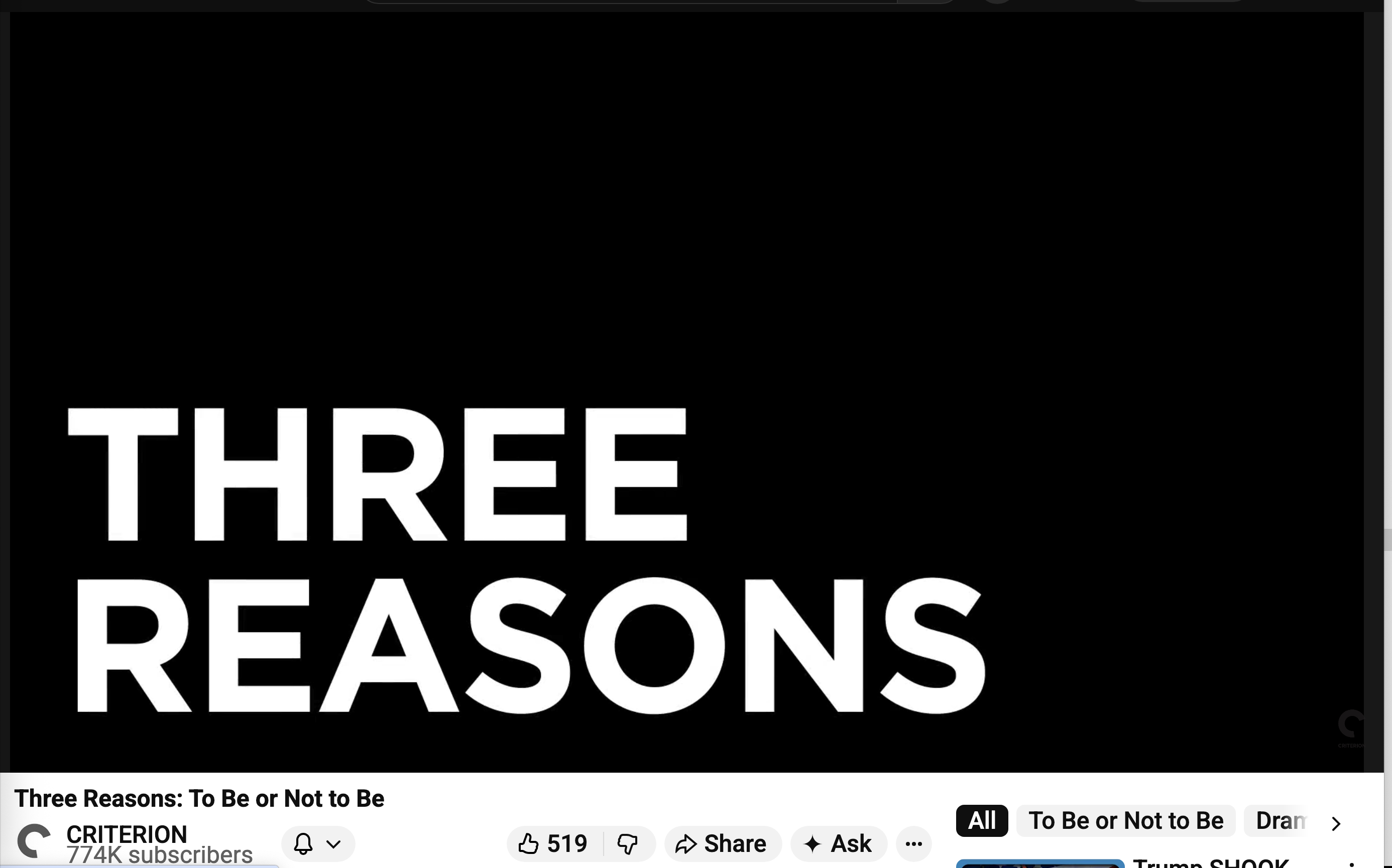 I have provided screen captures of the this film essay, including the default image of the video (tht shot is also included in the third reason and is arguably the most important shot in the film). The screen captures help you to quickly grasp the structure (or fomula) of the Criterion film essay (prologue with Criterion logo, film title, director " three reasons." Then reasons one, two and three follow, the third ending with the Criterion logo (the capital "C") superimposed over the frame, fade to black with "Criterion Collection" written across the bottom of the frame. The font in this video is consistent, as is the size of each number,In this case, you can see that the three reasons are brilliantly set up to end like a joke: Each reason is four words long, and the first three words of each reason are the same: "1 because it's so . . . ; 2 because it's so . . . (the opposite of reason one) . . . ; 3 because it's so . . . (punchline)." Moreover, the content of third reason consists of two running gags in the film that both end in the video with the punchlines: "Heil myself" and "We do the concentrating and they do the camping" [Laughter]. The first and second reasons have to be sequenced from dark to light for the punchline to work. There's a down, then up, then up order to the reasons. Going from the light to dark would not work. Up, down, down? Note also the brilliant sound design and the last second addition of a line of dialogue after the punchline and just as the Criterion Collection title (across the bottom of a black screen) begins to disappear. Squeezing in a kind of sound epilogue, the shot of the Criterion title fades to black just as we hear (off-screen) the man making an ominous comment to the woman: "in real life, it's even more important that you choose the right side." The film, we are to gather, is not just a joke. It may be serious. Or it may be a bad joke.